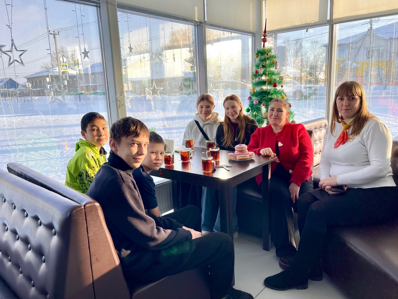 Но активный отдых — лишь половина удовольствия. Завершился день традиционным русским способом — горячим чаепитием. Тёплые кружки чая с ароматными пончиками и сладостями стали идеальным дополнением к насыщенному дню, согревая ребят изнутри и создавая атмосферу настоящего зимнего праздника.